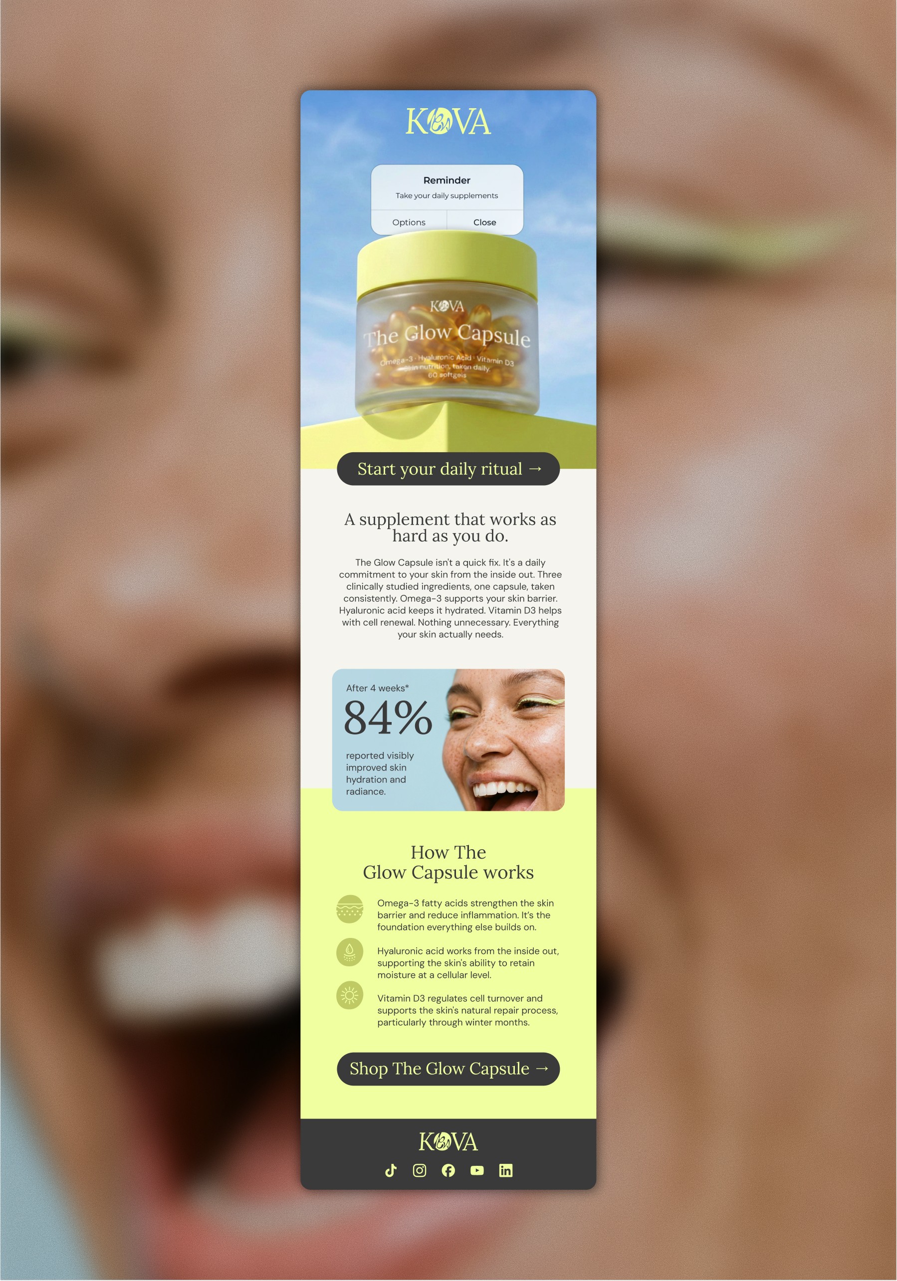 KOVA was built on a simple observation: most people spend more time choosing a moisturiser than they do choosing a supplement. Founded on the belief that what you put inside your body should be as considered as what you put on it, KOVA makes vitamins for people who care about their health without the noise of the wider wellness industry. No unnecessary ingredients, no overcrowded formulas, no promises that can't be backed up. Just the things your body actually needs, made properly.