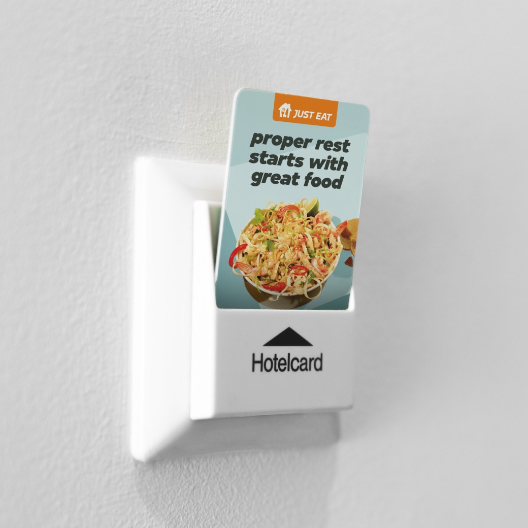 A cohesive set of in-hotel materials including key card wallets, in-room table tents, lift posters and digital screens. The designs blended Hilton’s refined tone with Just Eat’s recognisable visual language, creating a campaign that felt natural, polished and engaging from check-in to check-out.