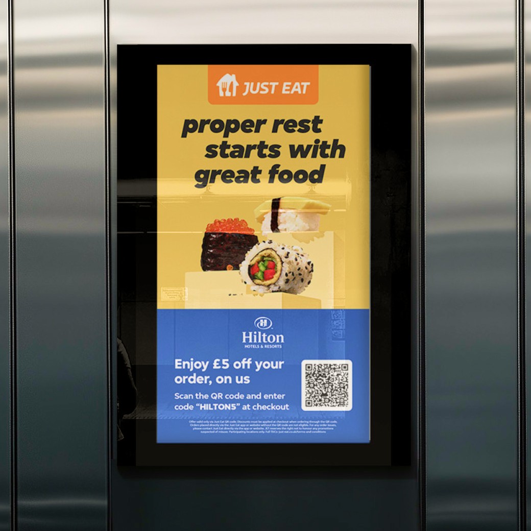 The campaign needed to balance two distinct brand worlds - Hilton’s premium, understated aesthetic and Just Eat’s bold, energetic identity, while feeling seamless within the hotel environment. Assets had to work across physical and digital touchpoints without disrupting the guest experience.