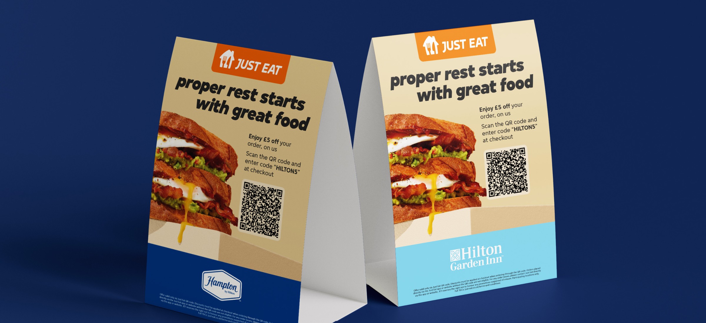 To celebrate a nationwide partnership between Just Eat and Hilton Hotels, I designed a suite of branded materials promoting an exclusive guest discount across Hilton, Hampton by Hilton and Hilton Garden Inn locations throughout the UK.